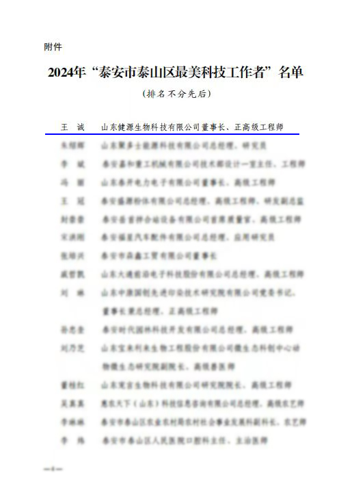 4月18日,泰安市泰山區(qū)區(qū)委宣傳部、區(qū)科協(xié)、區(qū)教體局、區(qū)科技局、區(qū)工信局、區(qū)農(nóng)業(yè)農(nóng)村局、區(qū)衛(wèi)健局聯(lián)合下發(fā)《關(guān)于公布2024年“泰安市泰山區(qū)最美科技工作者”的通知》,山東健源生物科技有限公司董事長(zhǎng)王誠(chéng)榮獲2024年“泰安市泰山區(qū)最美科技工作者”榮譽(yù)稱號(hào)。