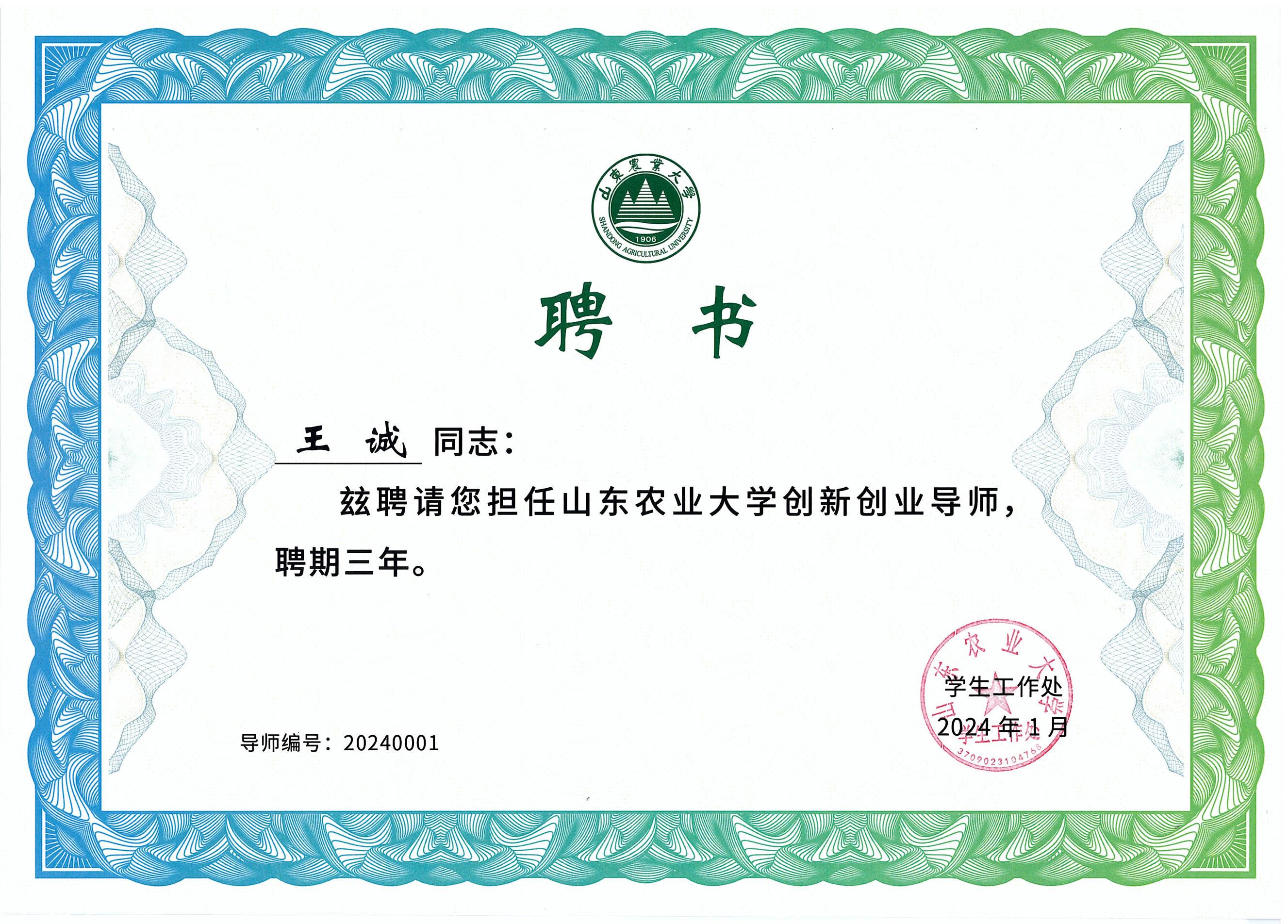 在創新創業之路上,王誠董事長一步一腳印,以實際行動踐行科技工作者精神,取得了一系列科研技術和成果突破,被聘請為“中國科協科技人才獎項評審專家”。2023年榮獲泰安市青年科技創新獎,作為項目第一完成人榮獲泰安市科學技術獎科技進步一等獎,2024年4月榮獲“齊魯最美工程師”稱號。被山東農業大學聘請為“創新創業導師”和“研究生校外行業導師”。