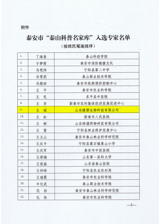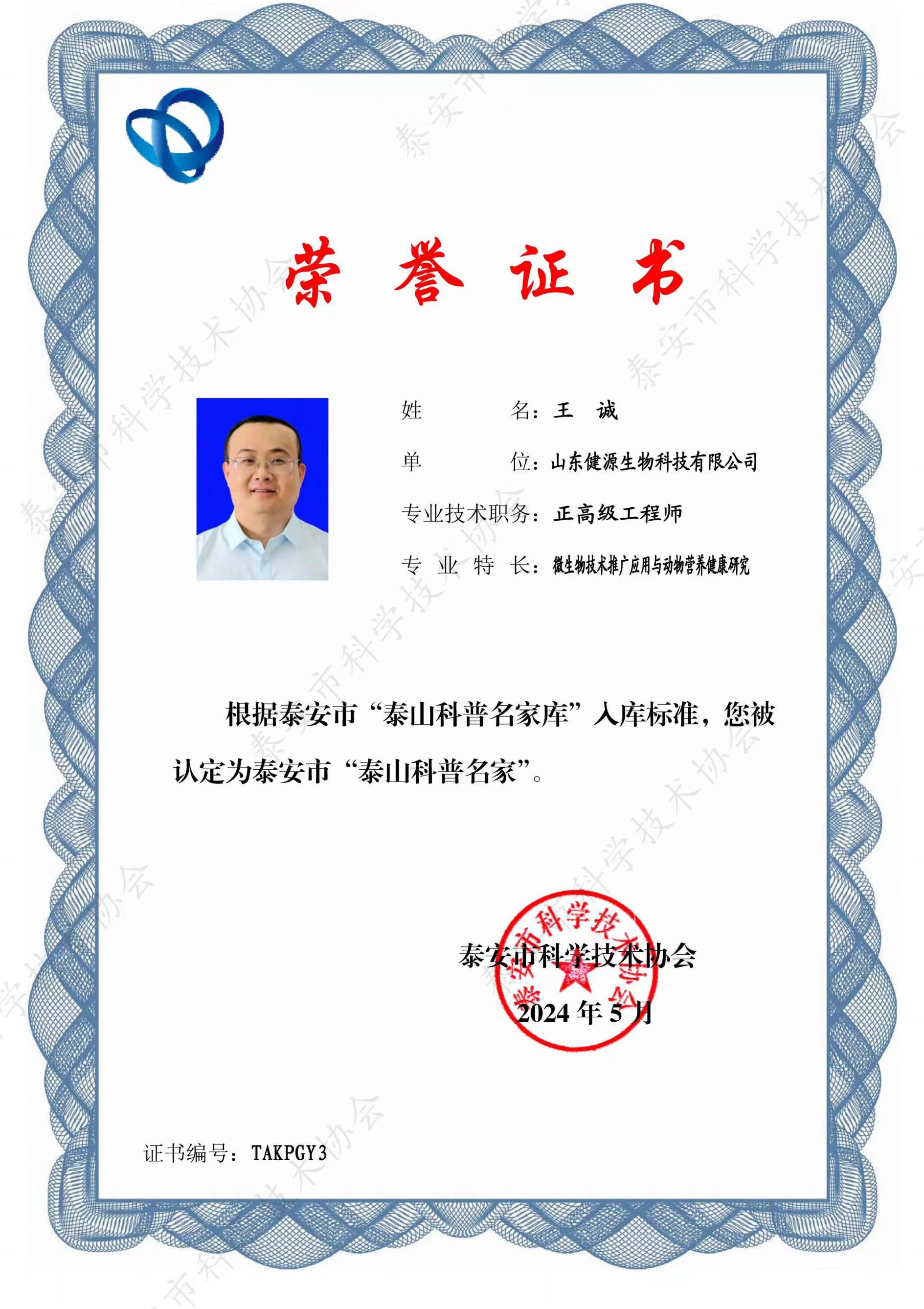 發布時間:[2024-6-6 16:33:30] 瀏覽量:2609次近日,泰安市科學技術協會公布了泰安市“泰山科普名家庫”入選專家名單,根據泰安市“泰山科普名家庫”入庫標準,山東健源生物科技有限公司董事長王誠被認定為泰安市“泰山科普名家”。