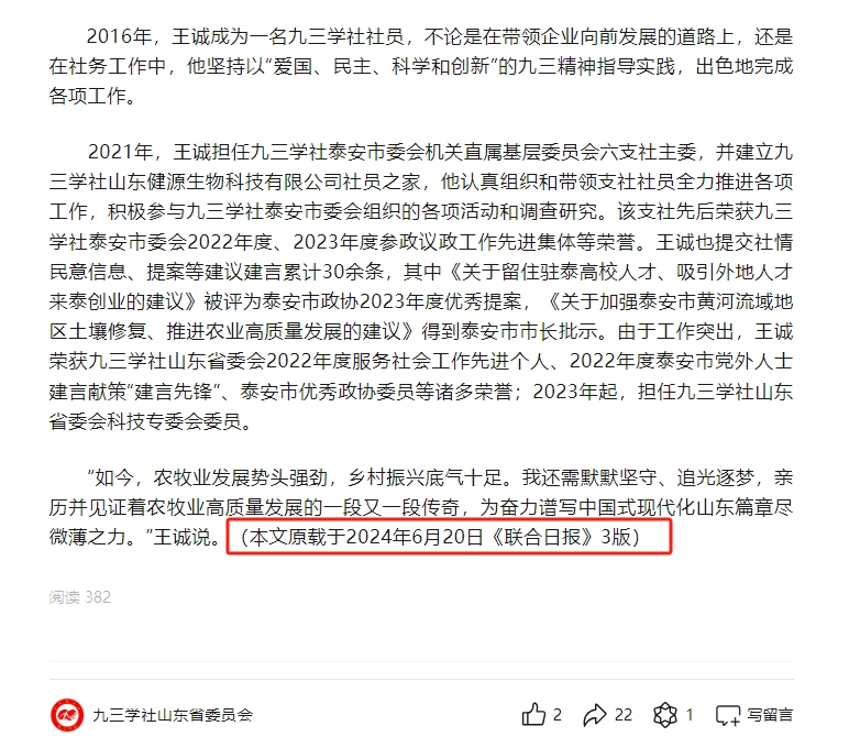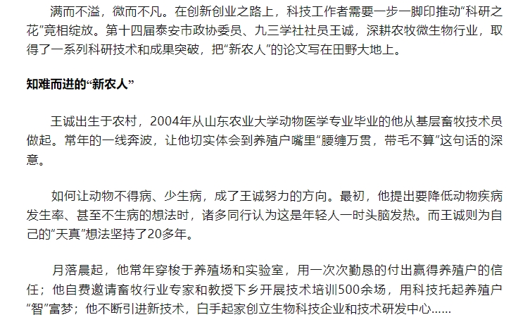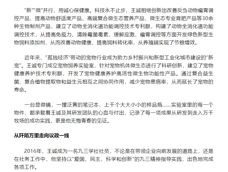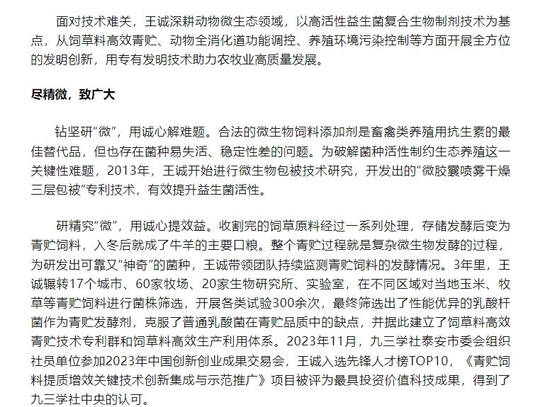 日前,王誠董事長接受了聯(lián)合日報記者的采訪,報道發(fā)表在2024年6月20日《聯(lián)合日報》3版,講述了王誠董事長作為“新農(nóng)人”,20多年來深耕微生態(tài)領(lǐng)域,以高活性益生菌符合生物制劑技術(shù)為基點(diǎn),從飼草料高效青貯、動物全消化道功能調(diào)控、養(yǎng)殖環(huán)境污染控制等方面開展全方位的發(fā)明創(chuàng)新,用專有發(fā)明技術(shù)助力農(nóng)牧業(yè)高質(zhì)量發(fā)展。而作為一名九三學(xué)社社員,王誠董事長堅持以“愛國、民主、科學(xué)和創(chuàng)新”的九三精神指導(dǎo)實(shí)踐,出色地完成各項工作。該報道同時被九三學(xué)社山東省委員會轉(zhuǎn)載報道。