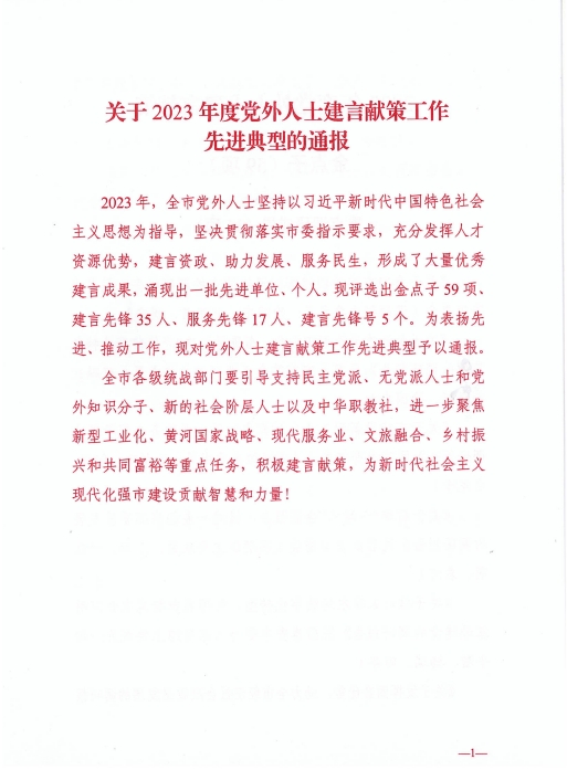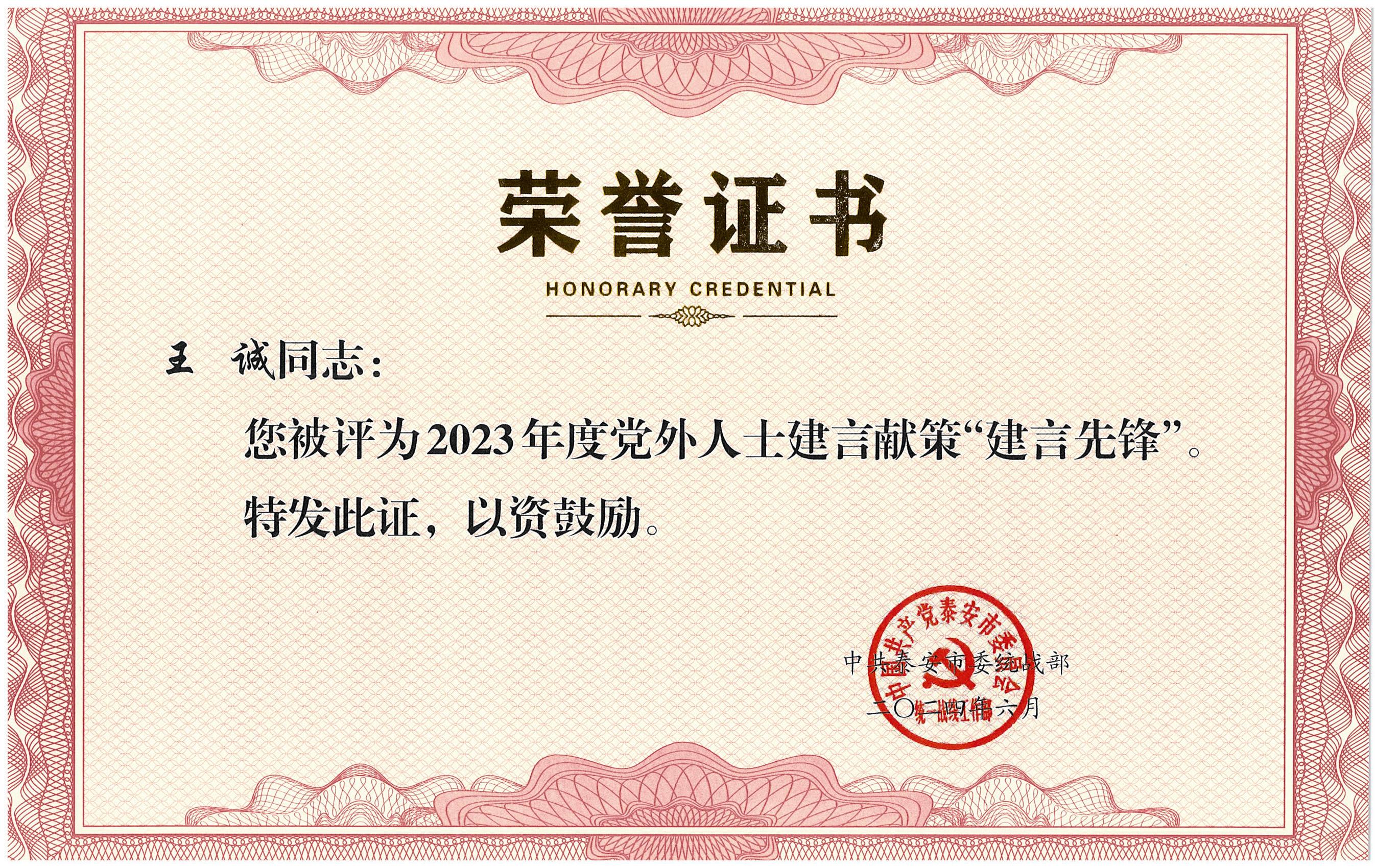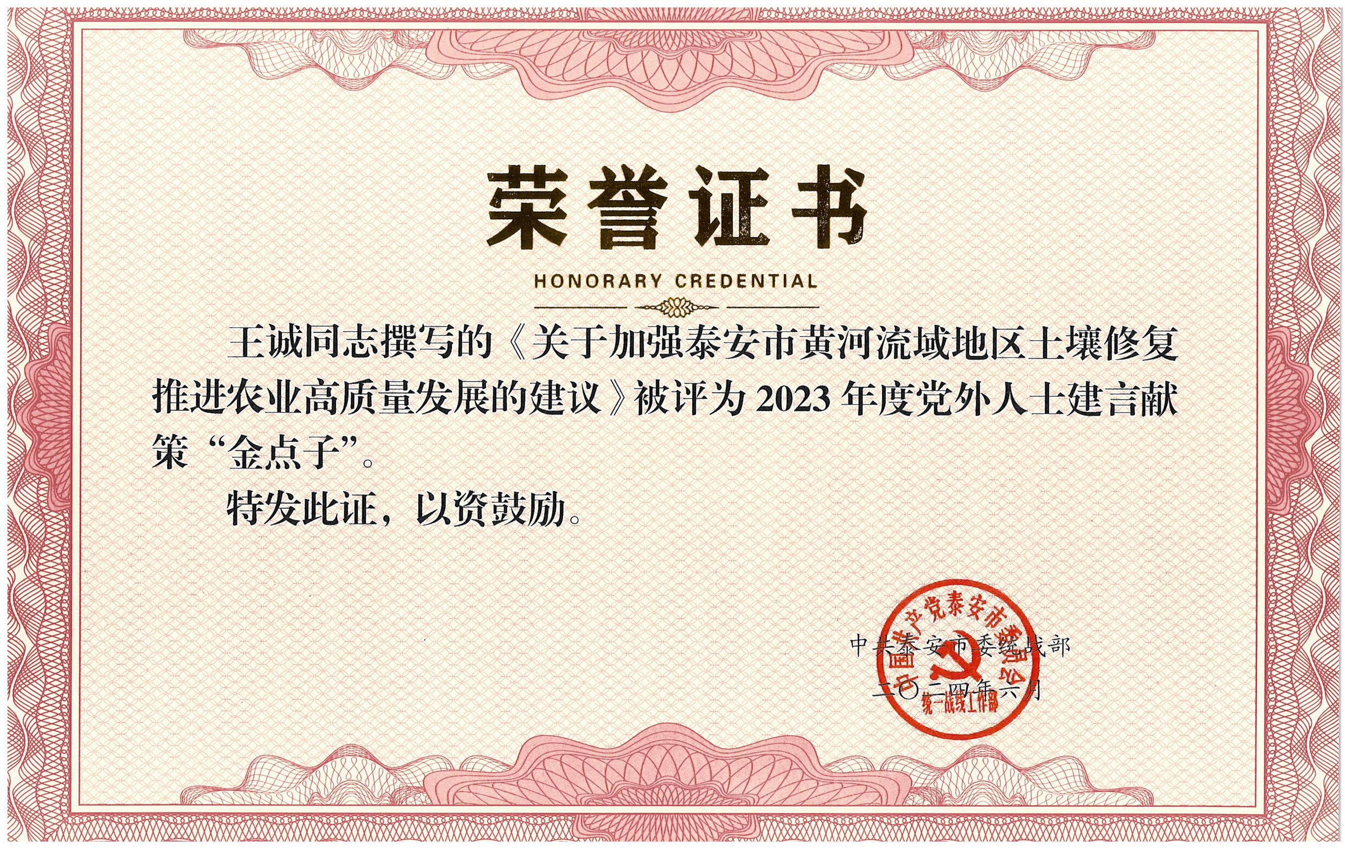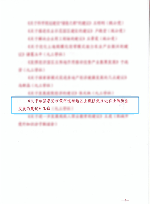 發布時間:[2024-7-9 17:52:5] 瀏覽量:3098次會上公布了《關于2023年度黨外人士建言獻策工作先進典型的通報》,王誠董事長被評為2023年度黨外人士建言獻策“建言先鋒”,撰寫的《關于加強泰安市黃河流域地區土壤修復推進農業高質量發展的建議》被評為2023年度黨外人士建言獻策“金點子”。