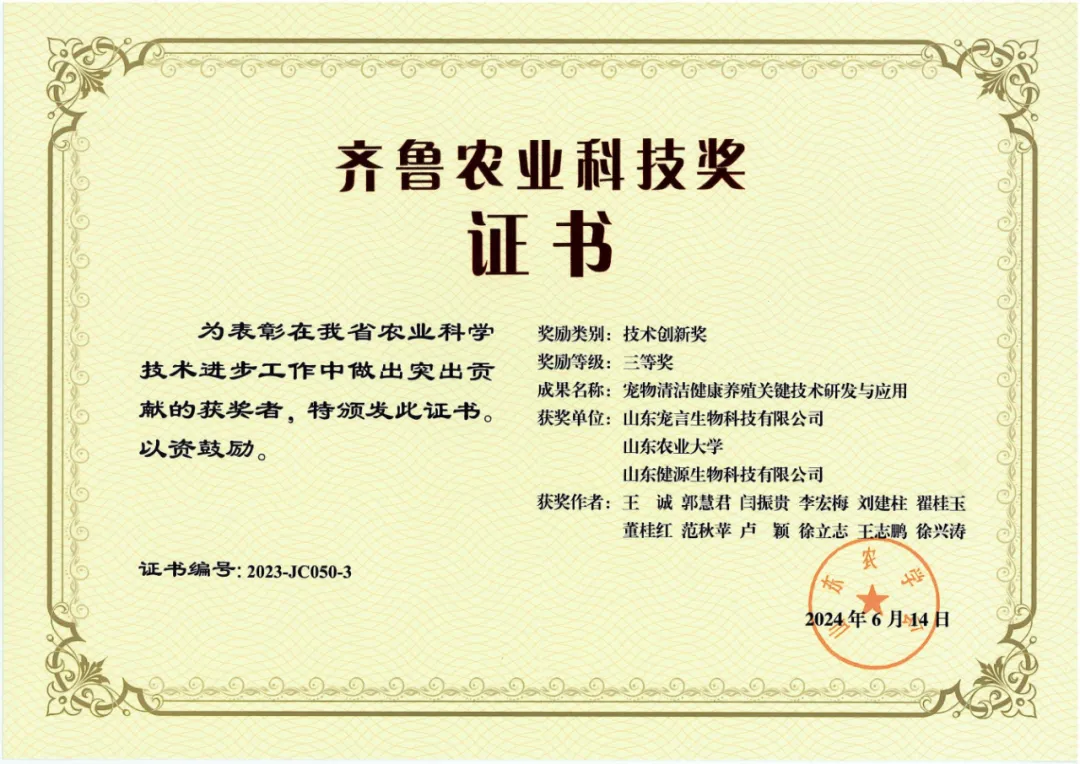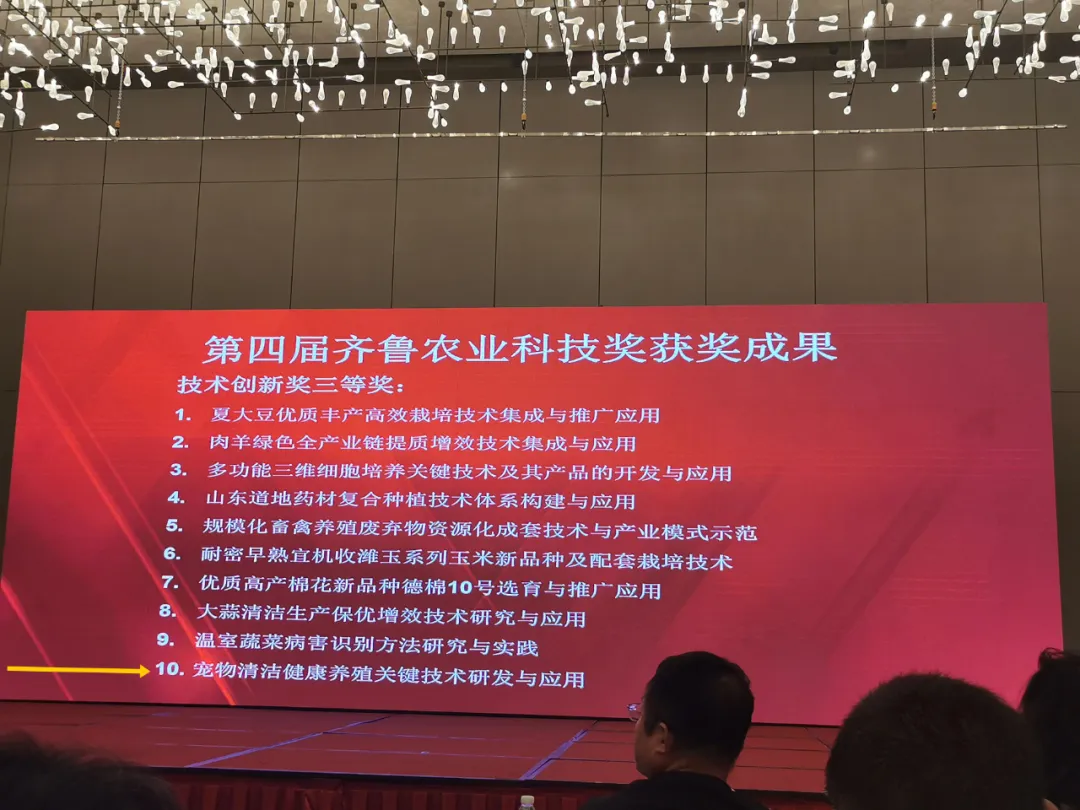 8月30日,第四屆齊魯農(nóng)業(yè)科技獎獎勵大會暨第二屆青年學(xué)術(shù)論壇在濟南召開,評選出77項2023年度齊魯農(nóng)業(yè)科技獎。山東健源生物科技有限公司與子公司山東寵言生物科技有限公司共同完成的“寵物清潔健康養(yǎng)殖關(guān)鍵技術(shù)研發(fā)與應(yīng)用”項目榮獲2023年度齊魯農(nóng)業(yè)科技獎技術(shù)創(chuàng)新獎三等獎。